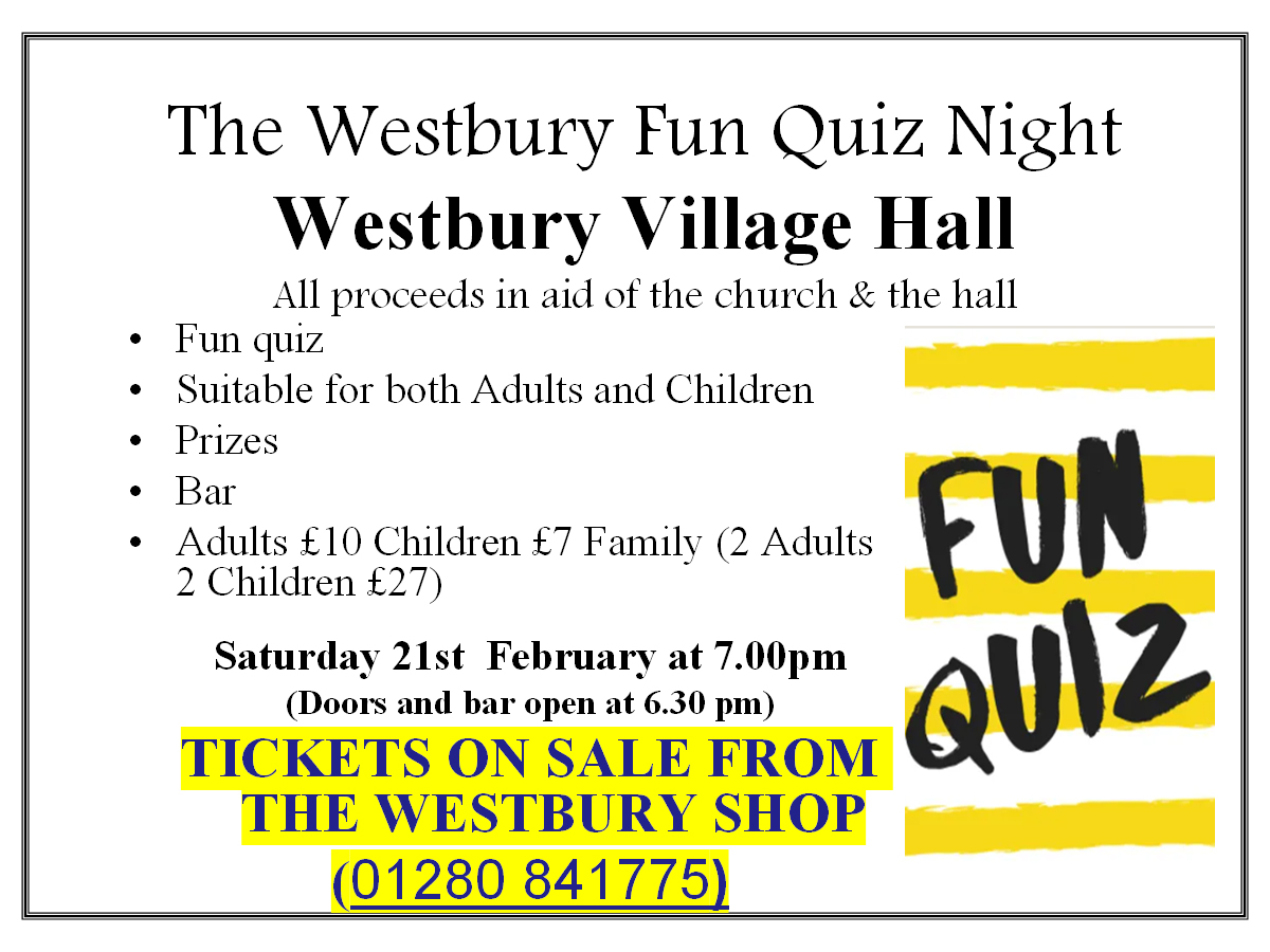 The Westbury Annual Fun Quiz is 21st February and tickets are now on sale from the Westbury Village Community Shop.